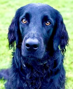 Leia is a black Flat Coated Retriever with a commanding yet affectionate presence. Her coat is sleek and lustrous, her build athletic and refined. She has an unflappable temperament, staying calm and focused in any environment. The Flat Coated Retriever was developed in Britain as a dual-purpose gundog, known for stamina, good humour and reliability. The breed quickly became popular for its combination of elegance and working skill, a dog equally at home in the field or by the fireside.