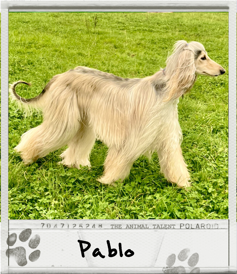 With his graceful stature and flowing coat, Pablo brings an air of sophistication wherever he goes. At two and a half years old, this cream domino Afghan Hound is an exceptional presence—elegant, striking and entirely self-assured. His fine-boned frame, long silky fur and distinctive facial structure give him an aristocratic quality that is unmistakable on camera. Cream domino is a particularly rare and photogenic colouration in Afghan Hounds, lending Pablo a soft, opulent aesthetic that contrasts beautifully with his confident demeanour.