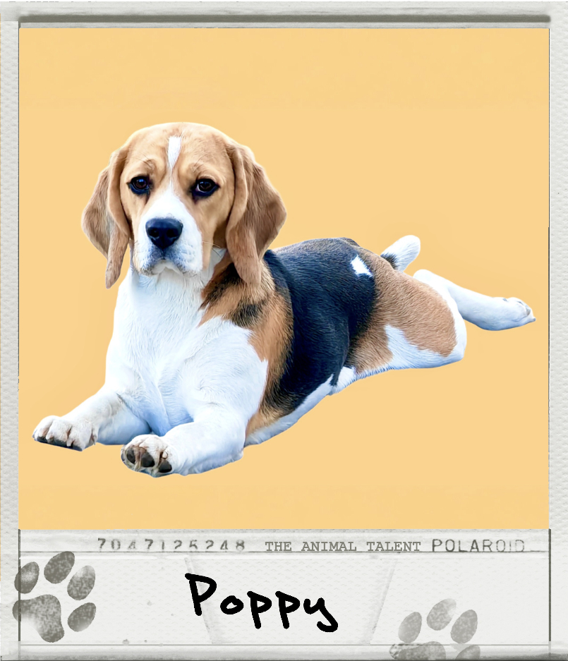 Poppy has an instantly endearing presence with her bright tricolour coat and lively expression. As a one year old Beagle she blends curiosity, affection and cheerful energy, making her a natural fit for engaging on screen moments. She belongs to a family of six Beagles who can be hired together or individually, offering productions a ready made group with natural cohesion and matching looks. With roots as British scent hounds, Beagles are known for intelligence and stamina, and Poppy mirrors this heritage through her alert posture and inquisitive nature. The classic tricolour Beagle has appeared frequently in popular culture as a symbol of friendliness and charm, which she embodies with ease.