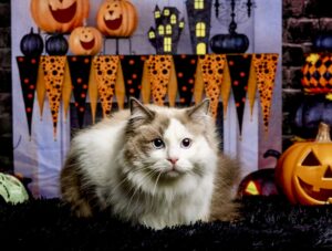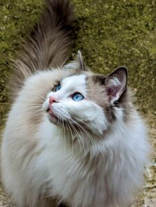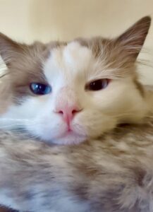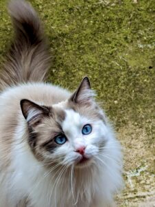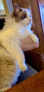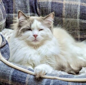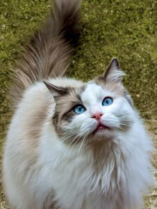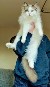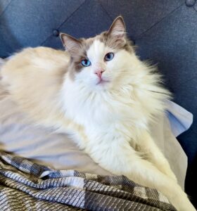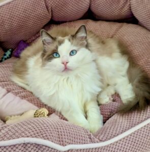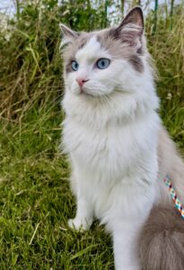 Reggie is a blue bi-colour Ragdoll cat with a personality as charming as his striking looks. Living with three other cats and a small dog, he thrives as the playful and cheeky “only boy” in the house. Reggie is incredibly affectionate, often cuddling or performing his signature “ragdoll flop” when picked up. He’s known for his chatty nature and clumsy antics, always entertaining those around him. A true bundle of energy, Reggie loves leaping for toys and playfully winding up his housemates.