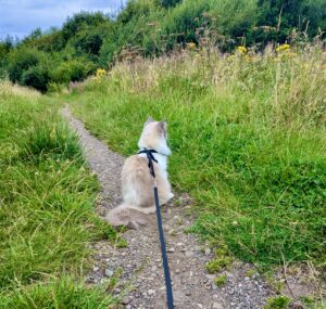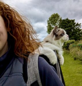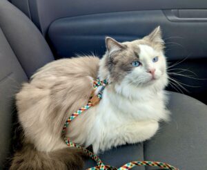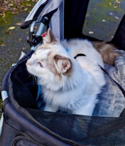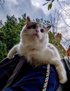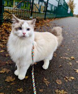 Although a house cat, Reggie is harness-trained and confident walking outdoors when introduced to spaces gradually. He’s also comfortable travelling in a pram or backpack, making him adaptable and versatile.