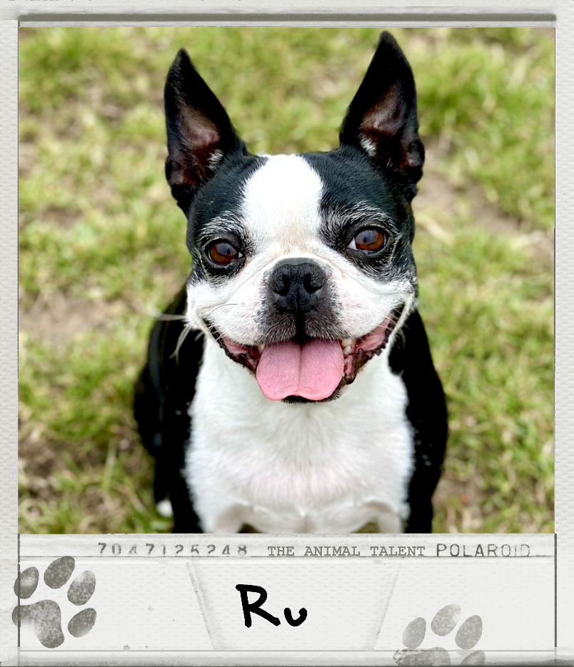 Full of heart and bursting with energy, Ru is a Boston Terrier who blends boundless enthusiasm with an affectionate soul. Compact and sturdy, she has the classic tuxedo-like black and white coat that gives her breed its distinctive “gentlewoman” appearance. Her expressive eyes and upright ears give her an alert, animated look, and her confident gait and muscular build make her both charming and athletic.